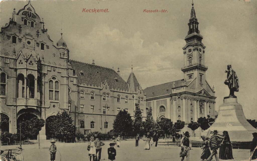 A kecskeméti Városháza és a Nagytemplom 1910 körül (képeslap, Kecskeméti Katona József Múzeum)