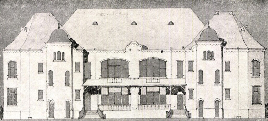Lechner Ödön és Sebestyén Artúr: Terv a „kecskeméti elmekórház” pályázatához (Magyar Építőművészet 1908/9.): kórházi épület, homlokzat