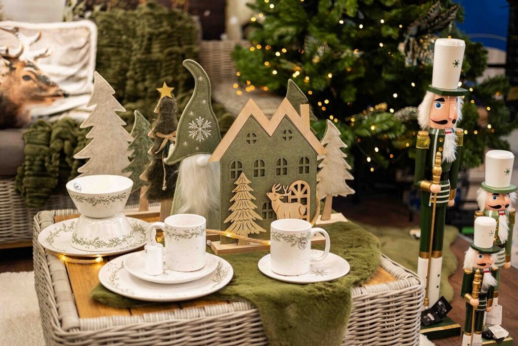 Az asztalt is ennek megfelelően teríthetjük zöld textíliákkal, áttetsző üvegkiegészítőkkel és finoman csillanó fémes részletekkel, amit piros és fehér díszekkel, illetve gyertyákkal, meghitt fényekkel tehetünk játékosabbá.