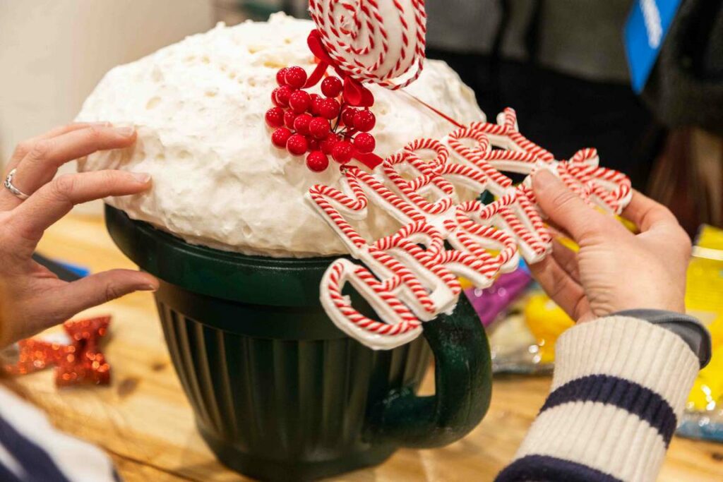 Egyszerűen készíthetünk vidám vendégváró díszt házilag a bejárati ajtó elé. Elég hozzá egy nagyméretű műanyag virágtartó, amiből pillanatok alatt látványos óriáscsésze varázsolható. Fessük át kedvenc színünkre, ragasszunk rá kartonból fület, amit szintén fessünk le. Ezután vágjunk a virágtartó tetejére kartonból tetőt: miután tetszés szerinti színre festettük, ragasszunk rá szalagokat, tobozt, gömbdíszeket vagy más dekort. Másik lehetőség, hogy például szivacshengerből szabunk és ragasztunk rá különböző méretű darabokat, amiket azután fehérre festünk, mintha csak forró habos kakaó lenne a csészében.