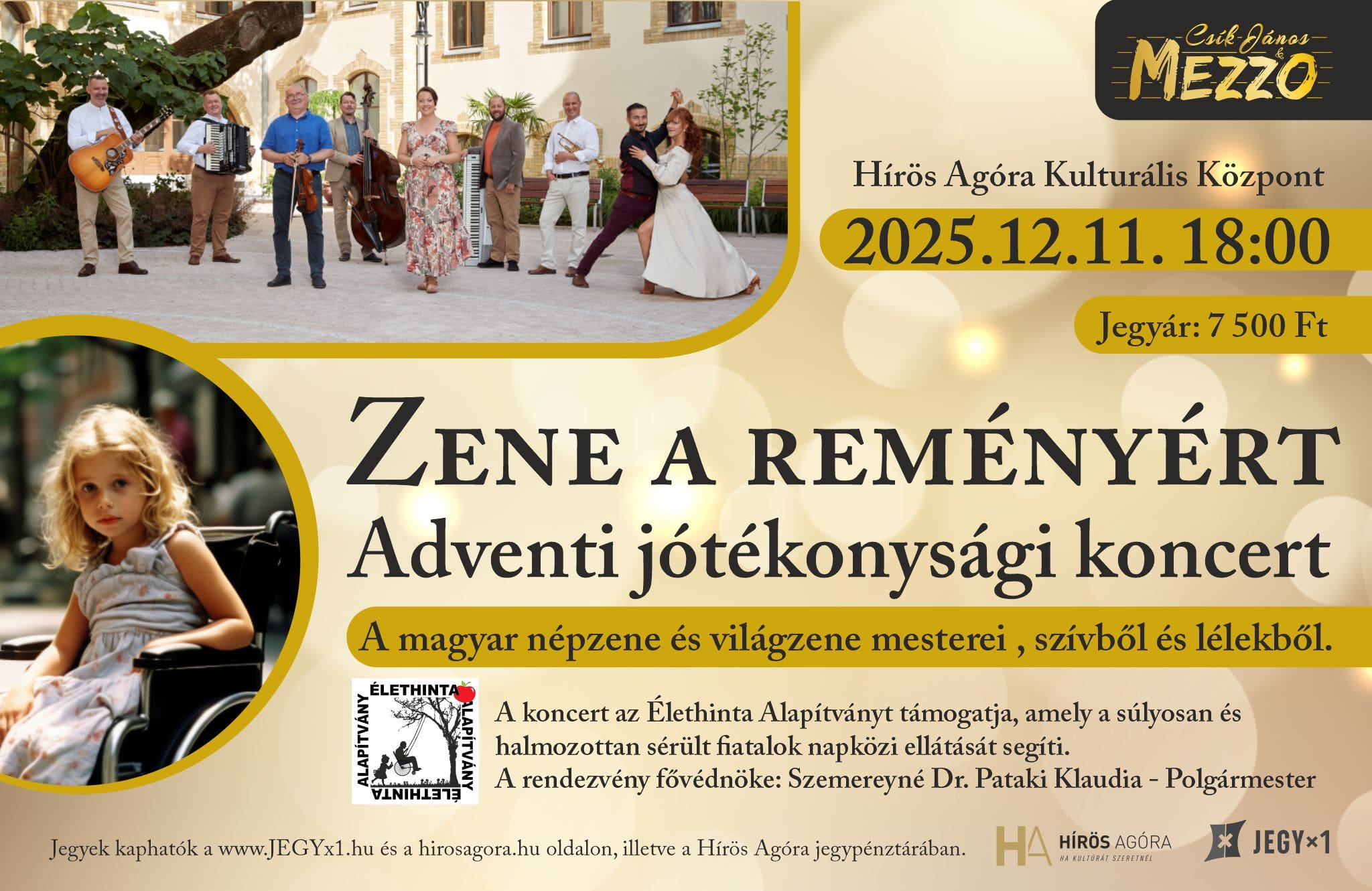 Jegyek kaphatók a Hírös Agóra jegypénztárában és online (www.jegyx1.hu): Zene a reményért – Adventi Jótékonysági Koncert | JEGYx1 – Élethinta Közhasznú Alapítvány linken.